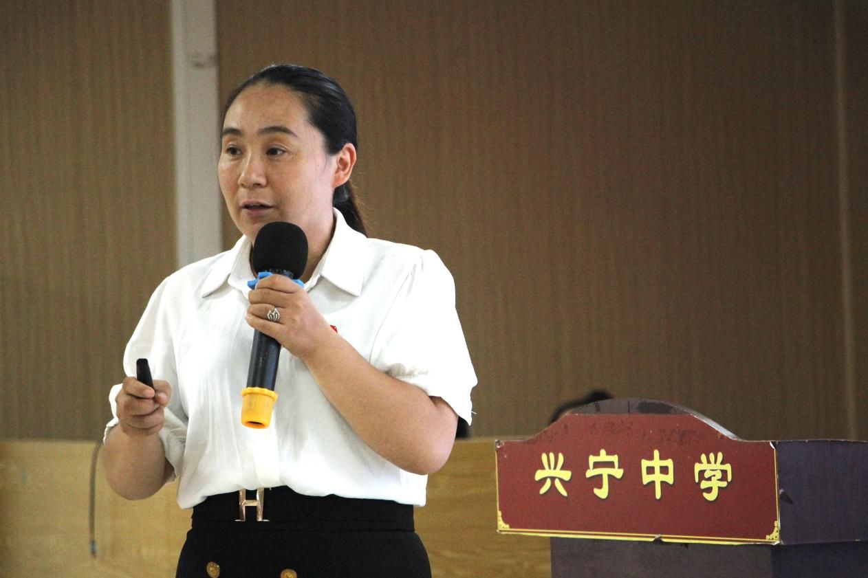 (兴宁中学党支部书记兼董事长王玉琴老师介绍支部情况)