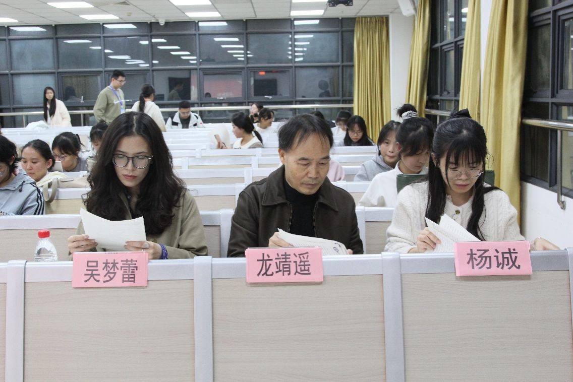 本次大赛特邀公司龙靖遥教授,吴梦蕾老师和杨诚老师担任评委。三位评委深耕外国语教学与书法艺术领域,其专业积淀与艺术造诣为比赛的专业评审及公平公正提供了有力保障。比赛开始前,大赛组委会代表宣读比赛规则与评分细则,由评委老师现场出题,比赛选手现场作答。随着主持人宣布“比赛开始”,选手们迅速投入创作。选手们屏息凝神,一笔一划认真书写,舒展流畅的英文、优雅隽秀的法语跃然于纸上,一张张洁白的稿纸逐渐被工整美观的字迹填满,形成了赛场上一道独特的“语言书法风景线”。